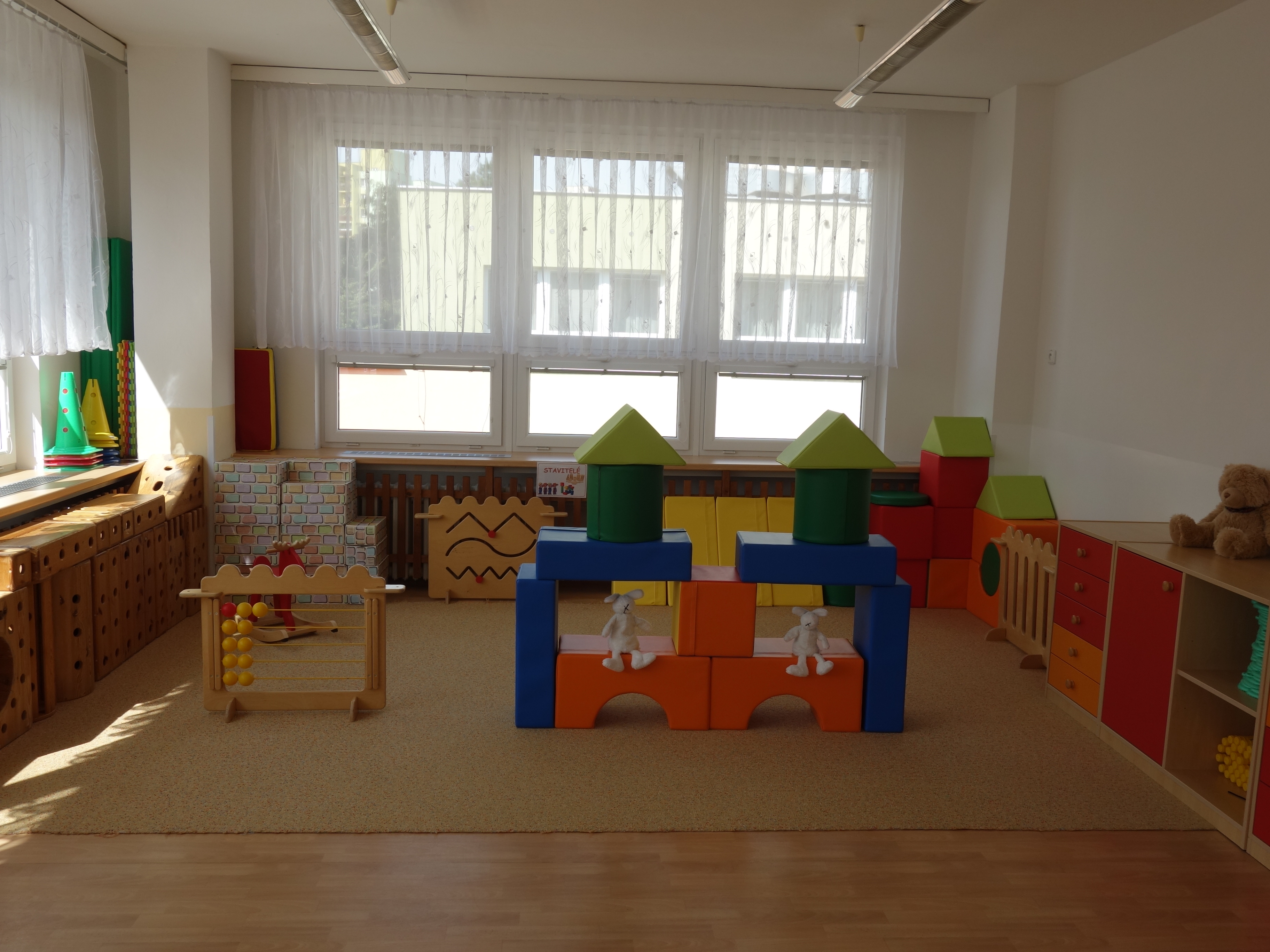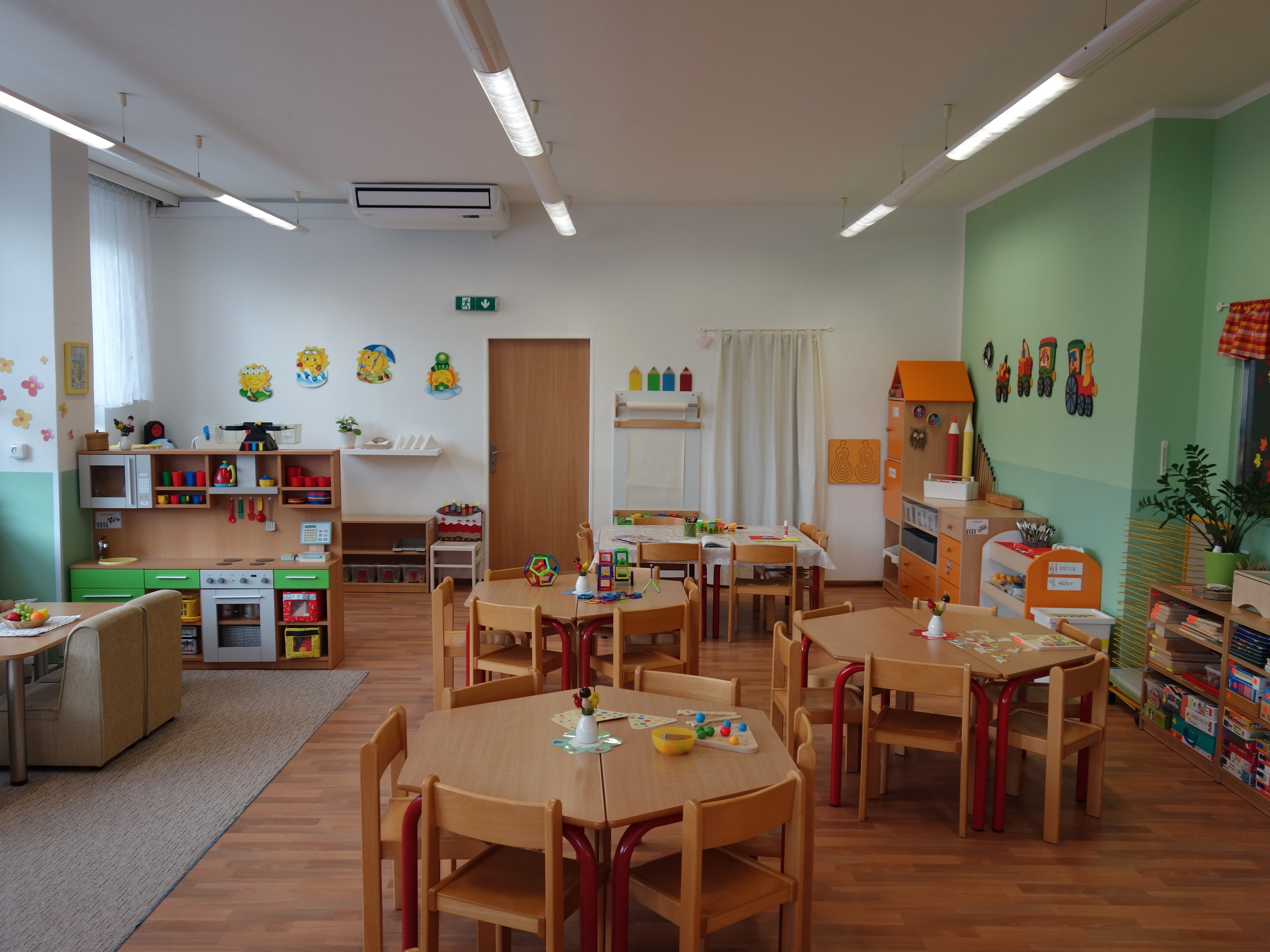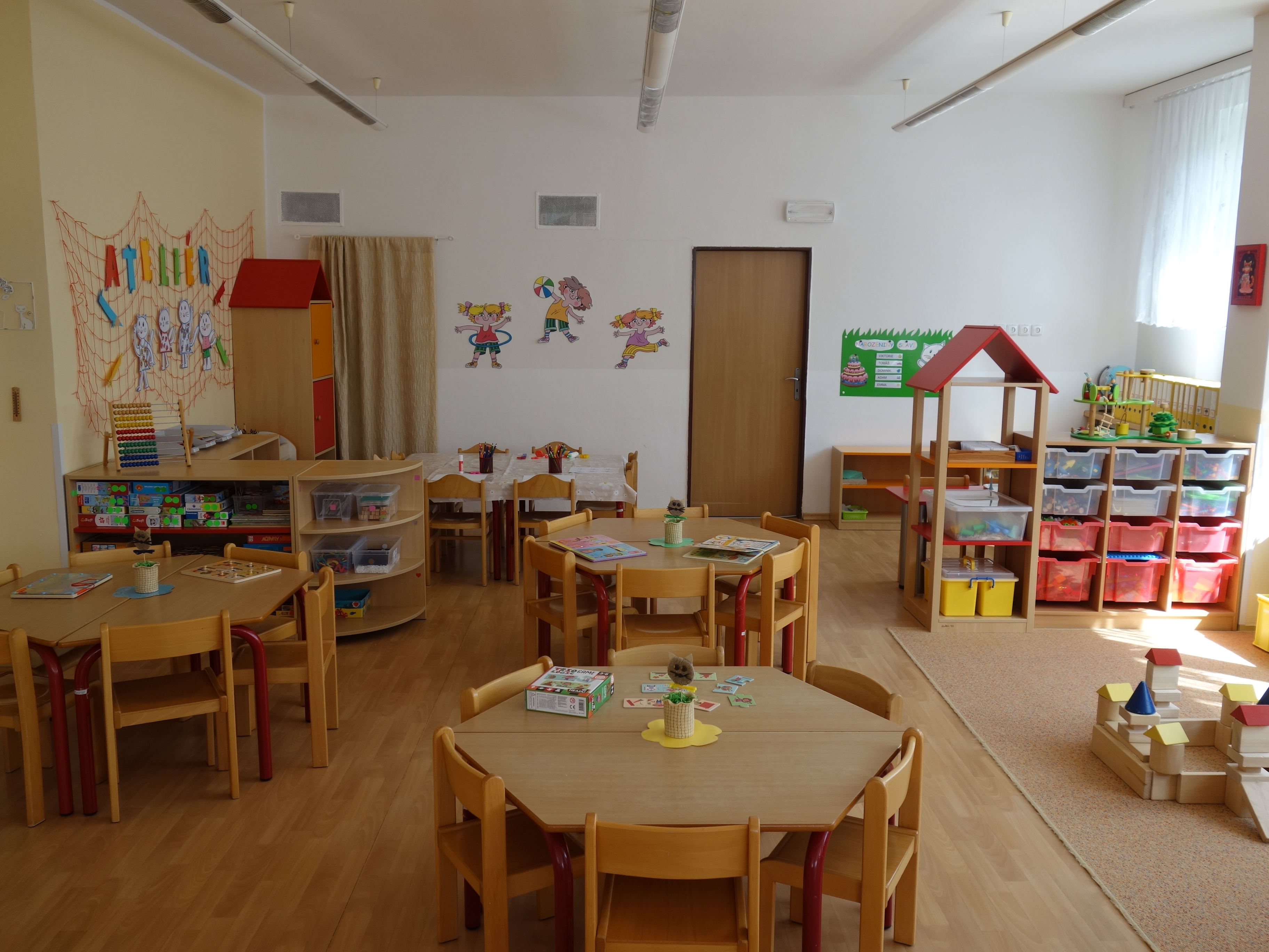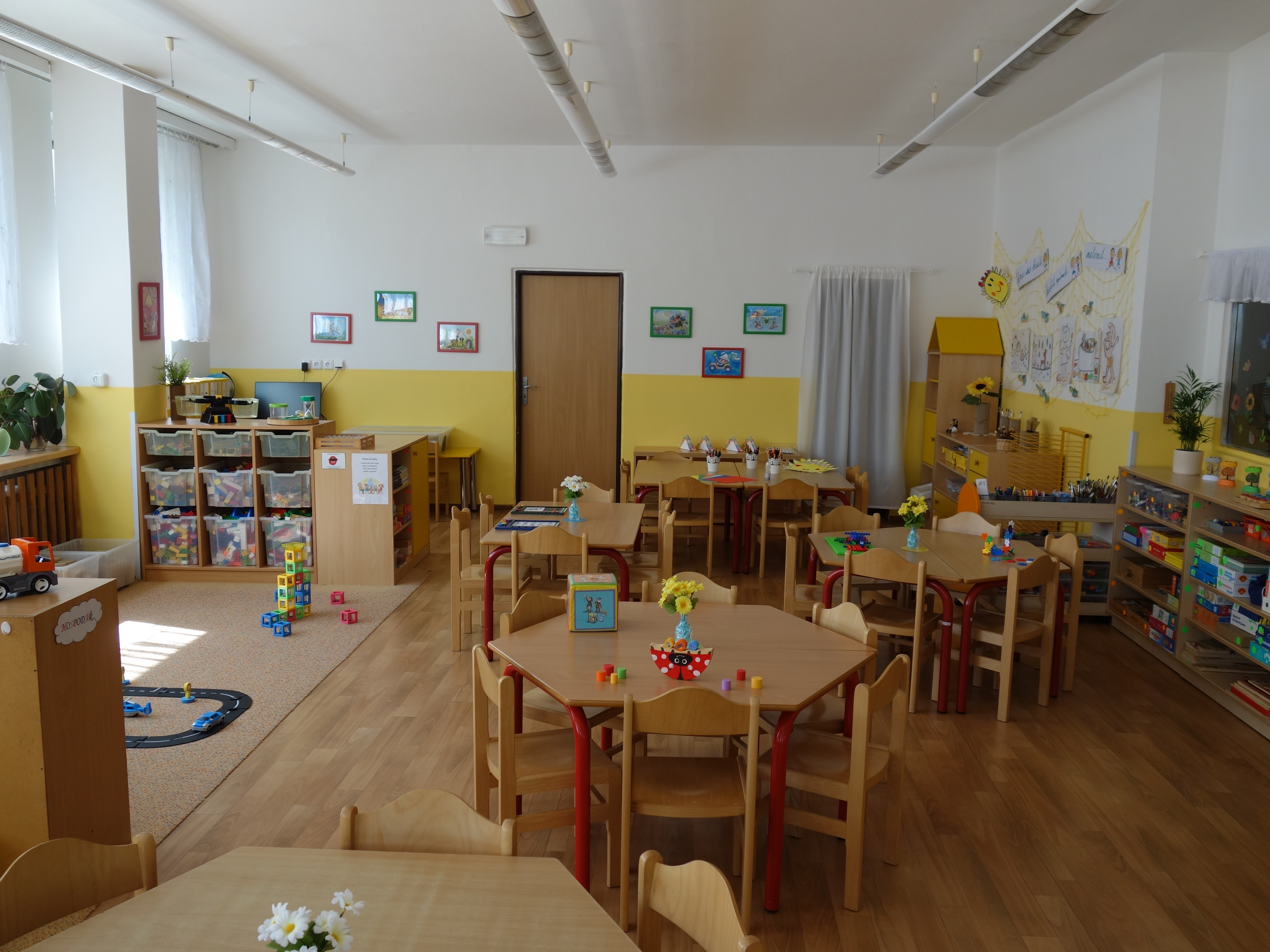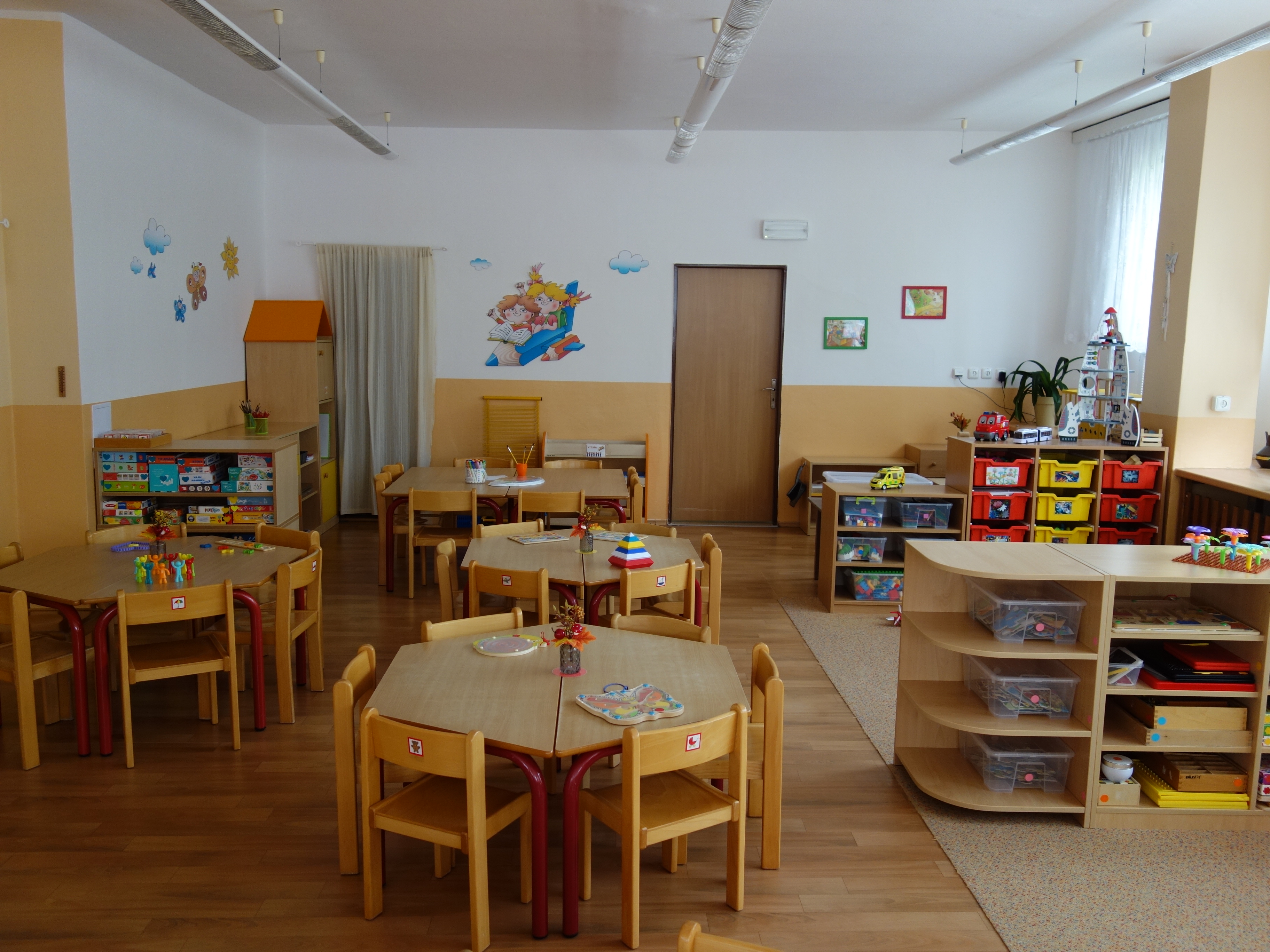 Děti se vzdělávají v pěti třídách – Hříbek, Kočička, Květinka, Motýlek a Sluníčko. Každá třída má svůj vlastní vchod do budovy, přípravnu jídla, sociální zařízení, šatnu pro děti i zaměstnance. Všechny třídy jsou vybaveny dřevěným nábytkem, který je rozdělen do několika hracích koutků, aby sloužily k celkovému rozvoji dětí. Hračky a didaktické pomůcky jsou umístěny tak, aby si je děti mohly samostatně brát a následně i ukládat. Ve třídě jsou k dispozici pomůcky pro pohybové, výtvarné, hudební a jiné činnosti. Dbáme na to, aby děti byly vedeny k rozvoji sebeobsluhy, současně klademe důraz na pitný režim a dostatek pohybu. Výzdoba tříd a šaten se pravidelně obměňuje, aby se v nich děti cítily dobře a chodily do mateřské školy rády.