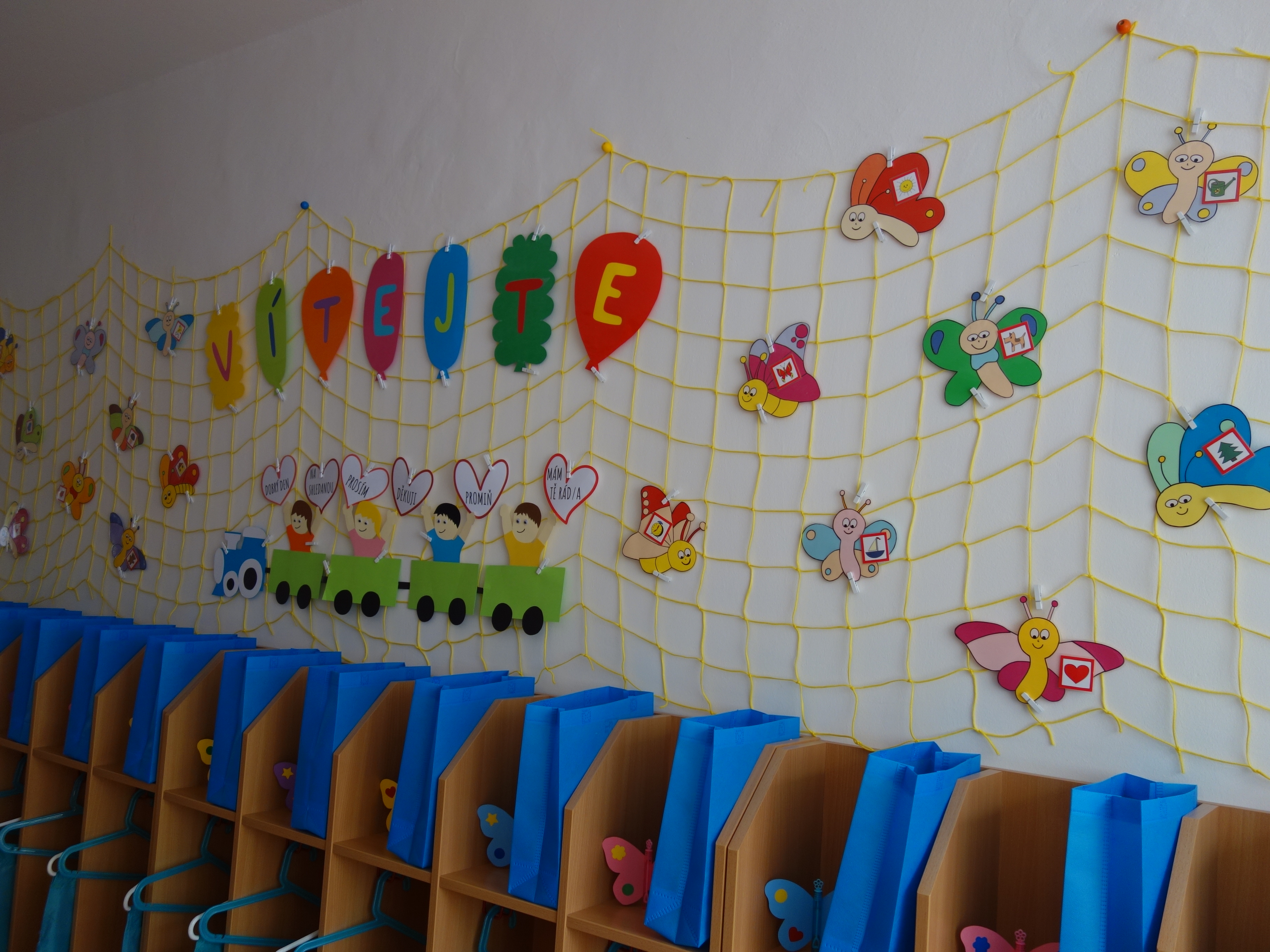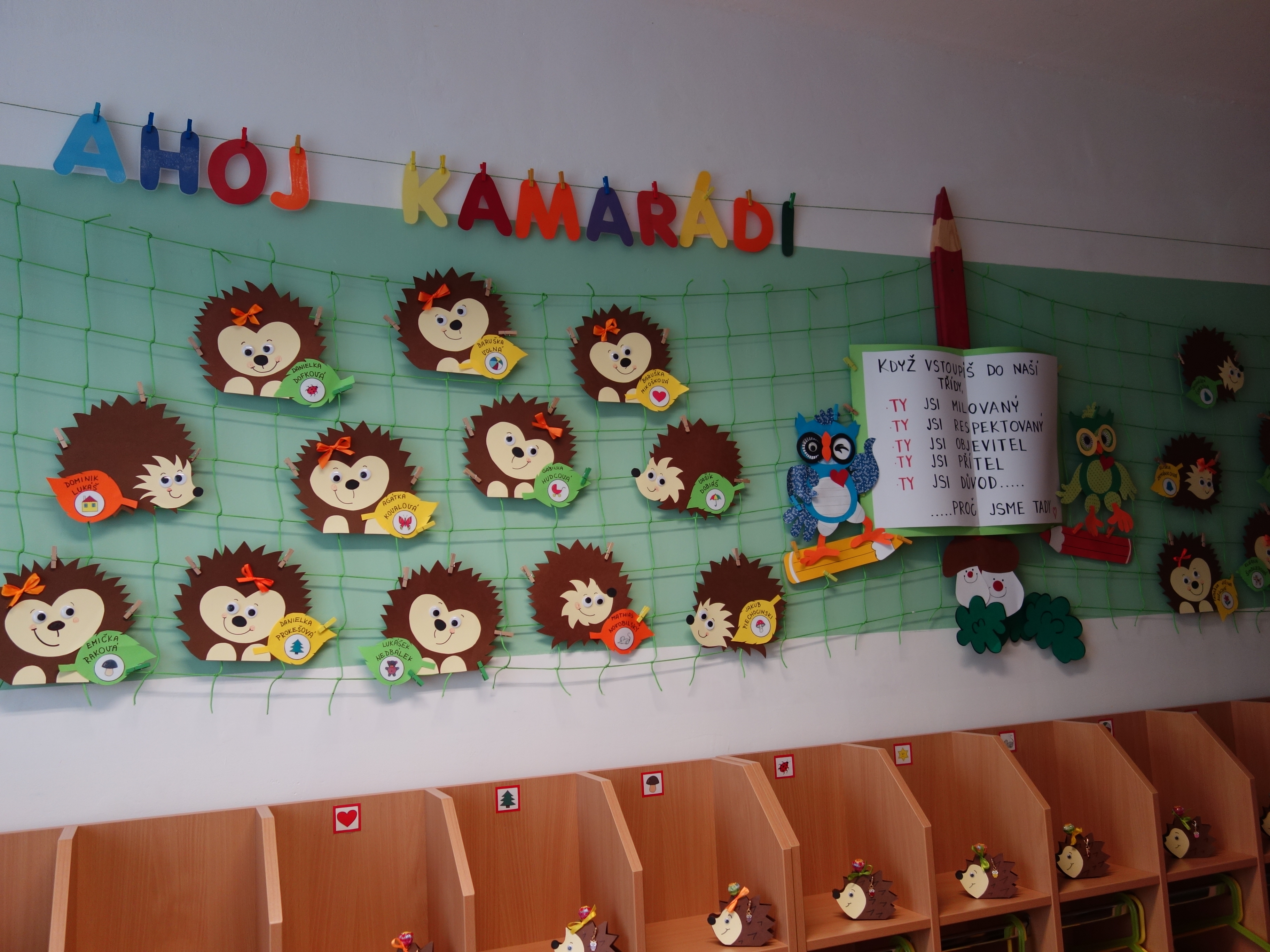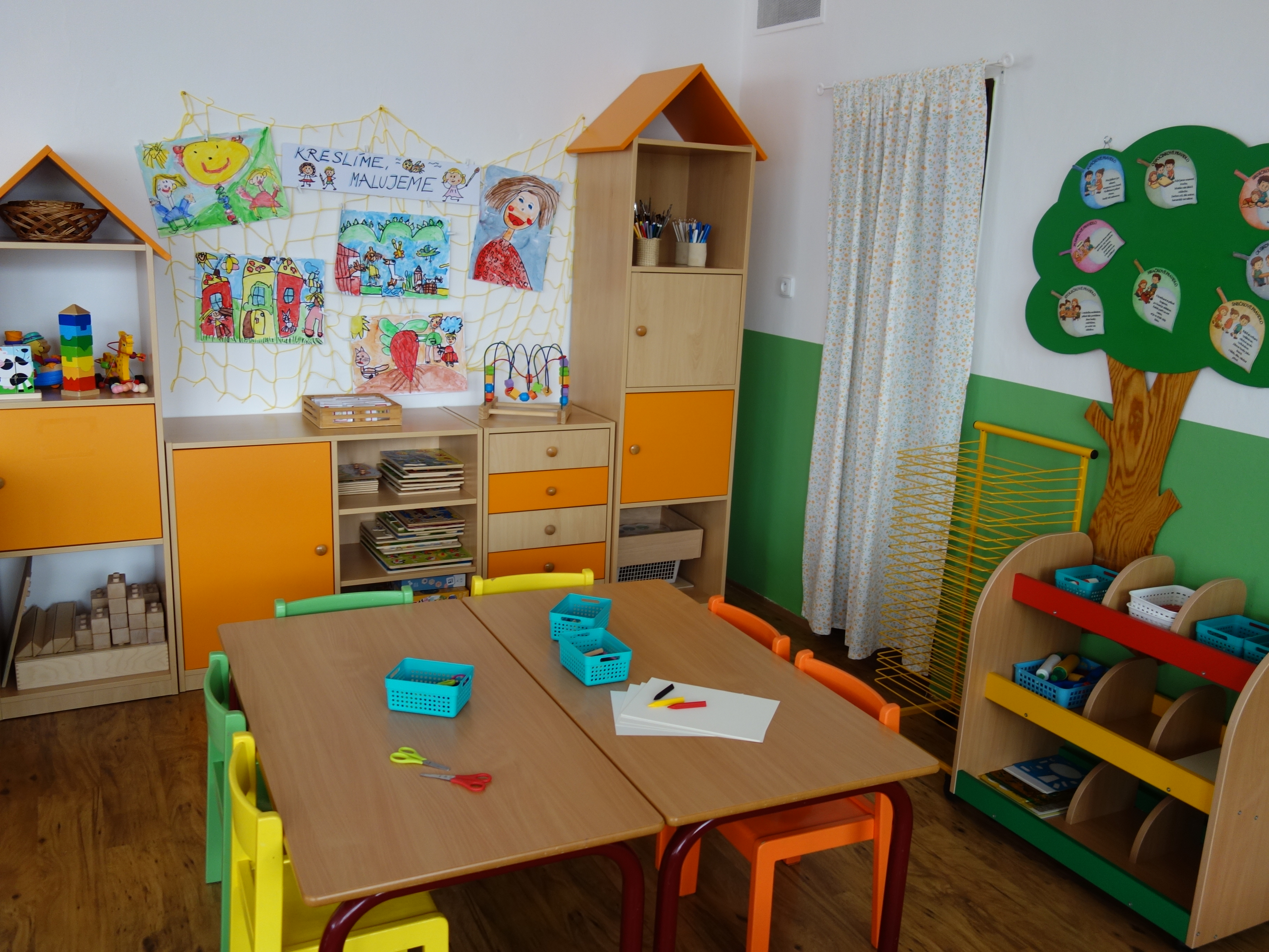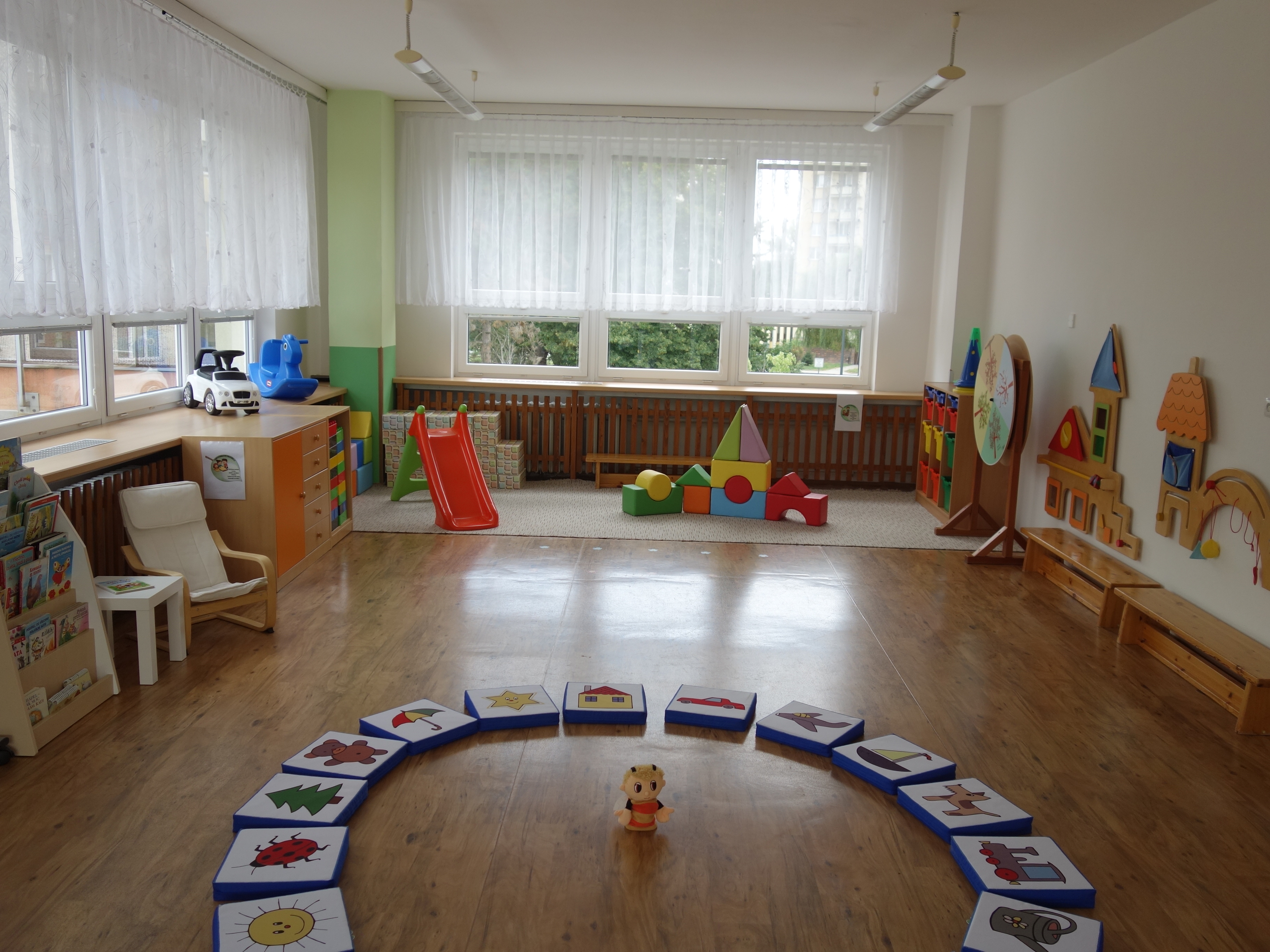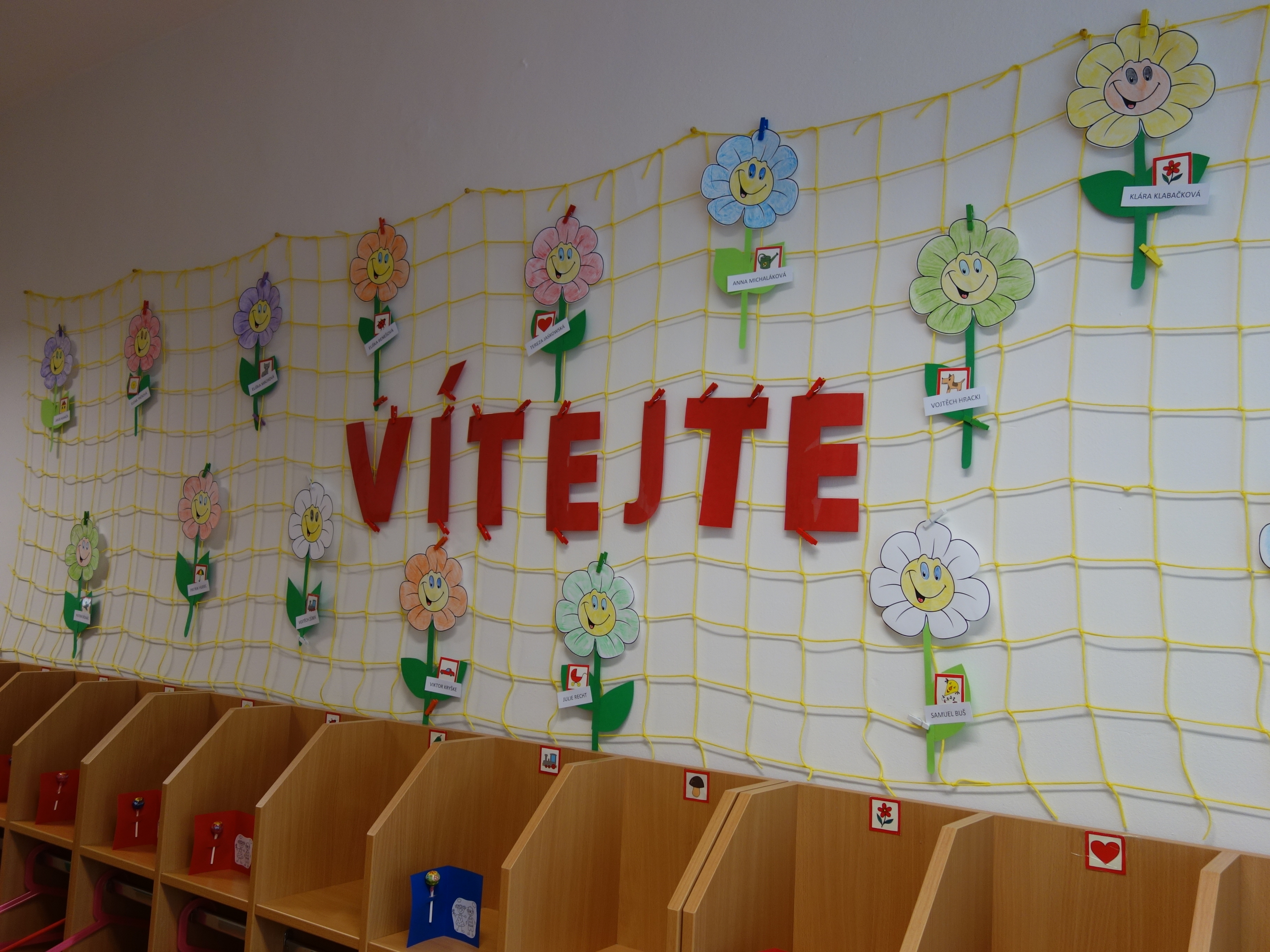 Děti se vzdělávají v pěti třídách – Hříbek, Kočička, Květinka, Motýlek a Sluníčko. Každá třída má svůj vlastní vchod do budovy, přípravnu jídla, sociální zařízení, šatnu pro děti i zaměstnance. Všechny třídy jsou vybaveny dřevěným nábytkem, který je rozdělen do několika hracích koutků, aby sloužily k celkovému rozvoji dětí. Hračky a didaktické pomůcky jsou umístěny tak, aby si je děti mohly samostatně brát a následně i ukládat. Ve třídě jsou k dispozici pomůcky pro pohybové, výtvarné, hudební a jiné činnosti. Dbáme na to, aby děti byly vedeny k rozvoji sebeobsluhy, současně klademe důraz na pitný režim a dostatek pohybu. Výzdoba tříd a šaten se pravidelně obměňuje, aby se v nich děti cítily dobře a chodily do mateřské školy rády.